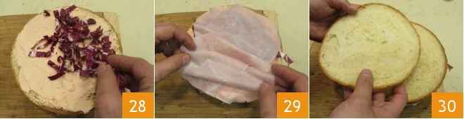 the radicchio 28 and the slices of prosciutto cotto 29, followed by another two discs 30;