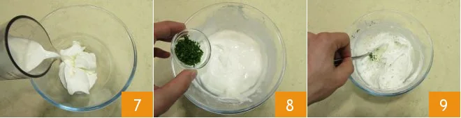 Melt the spreadable cheese in the milk 7, flavor with the finely chopped chives 8 and stir to mix the ingredients together 9; leave in the refrigerator as it will accompany the salmon.