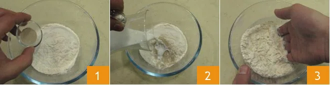 To make panettone start with the dough: place the sieved manitoba flour in a planetary mixer 1, along with the milk 2; add the brewers yeast 3 and start to mix, to obtain a coarse dough that isn't too smooth.