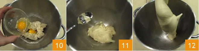 Mix briefly, then add the egg 10 and salt. Continue mixing with the hook to obtain a smooth and elastic dough. Now add the slightly softened butter, one piece at a time 11, wait until the previous piece is absorbed before adding another. Wait to obtain a glossy and elastic dough that wraps around the hook 12.