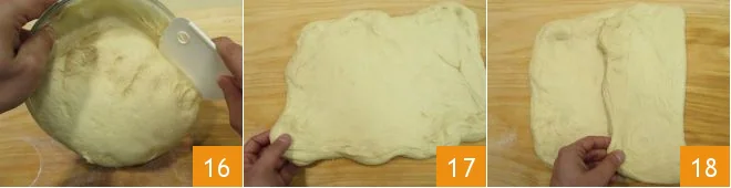Place the dough on a pastry board lightly sprinkled with flour 16 and spread it by pulling out the corners 17. Fold it 3 ways (18-19)