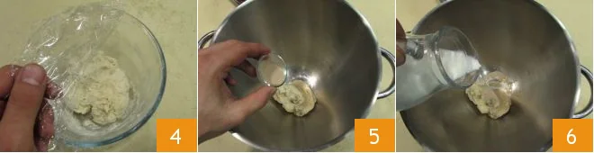 Cover the dough with plastic wrap 4. Leave the biga dough to rest in the refrigerator overnight (12 hours). The next morning, place the biga dough in the planetary mixer bowl with a hook. Add another 0.5 tsp of yeast 5, 0.5 cup of milk 6,