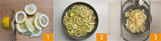 After the second resting period, rinse the lemons again and put them in a pot. Cover with water 4 and bring to a boil. Then drain the lemons and keep about 12 oz of the water in which you boiled them. Transfer the lemons back into the pot 5 and the indicated water 6.