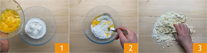 To prepare lemon tagliolini, first make the fresh pasta: in a bowl, pour the flour (you can use less than the recommended amount and add more as needed while kneading) and add the beaten eggs 1, then start mixing with a fork 2. When the ingredients start to combine, transfer to a surface to knead by hand 3. If necessary, add more flour little by little.