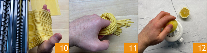 Collect the first tagliolini by hand 10 and roll them into nests 11; continue in this way until you run out of dough. Set aside the tagliolini nests on a tray dusted with a little semolina. Prepare the sauce: grate the lemon zest and squeeze its juice 12.