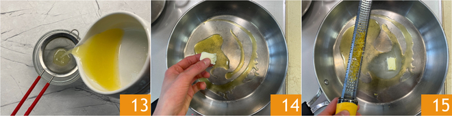 Strain the lemon juice 13 and weigh out 1.4 oz 13. In a large pan, pour the oil, a cube of butter (the rest will be used later), 14 thyme leaves, and lemon zest, then melt gently 15.