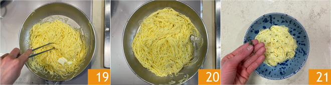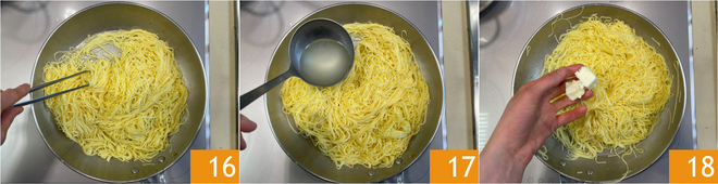 Cook the tagliolini in salted boiling water (not too vigorously) and cook for 1 minute. Drain the pasta into the sauce 16, add a ladle of the cooking water 17, and stir for a few moments to flavor. At this point, turn off the heat and mix in the remaining butter 18.