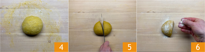 When you have a smooth and homogeneous dough, form a ball 4, and let it rest for at least 30 minutes at room temperature, in a cool, dry place. After resting, divide the dough into 2 portions 5; remember to keep the portion you are not using wrapped in plastic wrap to prevent it from drying out. Dust the portion you will roll out with a little semolina 6.