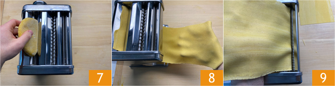 Now roll it out with the machine (alternatively, you can use a rolling pin), moving from the widest thickness to the narrowest until you get a very thin sheet 7. Cut rectangles of 10 inches in length 8, then cut the tagliolini using the appropriate roller of the machine (alternatively, roll the sheet on itself and cut the roll to obtain 1/16 inch wide strips) 9.