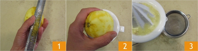 To make lemon chicken, start by grating the peel 1, squeezing 2 and filtering 3 the juice of a lemon.