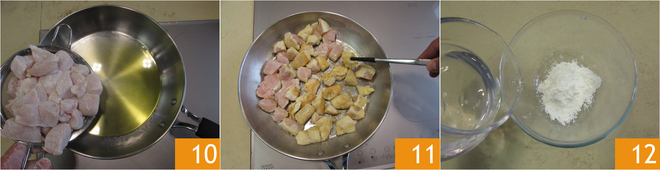 Now place the chicken in the flour 7 and stir until thoroughly coated 8. Heat the olive oil in a pan 9;