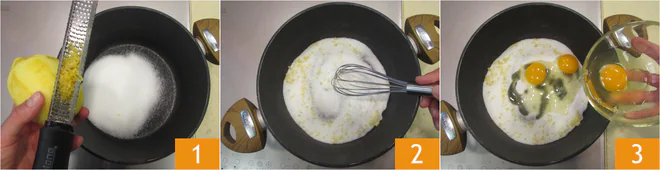 To make lemon curd tart, start by preparing the cream: place the sugar and the grated lemon peel in a saucepan (not a steel one) 1, then stir thoroughly with a whisk 2. Add the eggs 3 and stir some more to amalgamate.