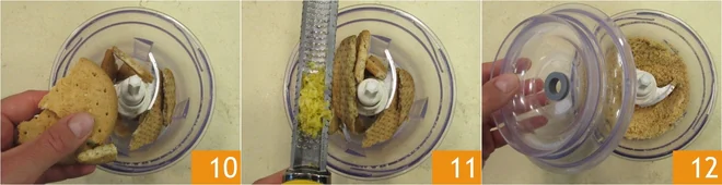 Prepare the base in the meantime: melt the butter and leave to cool, then place the biscuits in the mixer 10, together with the grated lemon peel 11. Blend thoroughly 12.