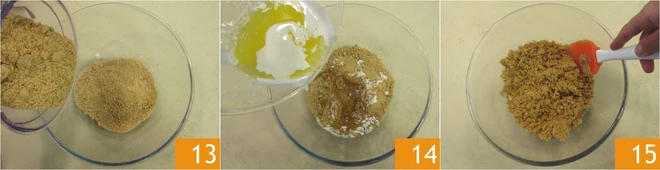 Place the blended biscuits in a bowl 13, add the melted butter 14 and amalgamate with a spatula 15.