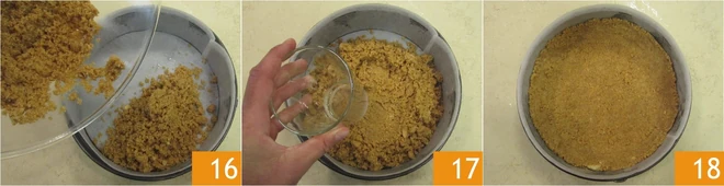Line an openable 9.5" diameter mold with parchment paper and pour in around half of the biscuit mixture 16, then press it over the base using a glass 17. Use the remaining mixture to create the edges and leave to firm up in the refrigerator for at least 30 minutes 18.