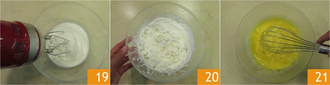 Once the cream firming time is up, beat the whipped cream with an electric whisk 19 20. Remove the cream from the refrigerator and soften by vigorously beating with a whisk 21.