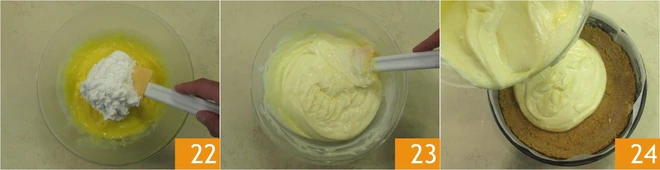 Gradually add the whipped cream 22 and delicately stir it in 23. Remove the cookie base from the refrigerator and pour the cream over it 34.