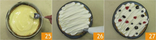Smooth the surface 25 and place back in the refrigerator for around 2 hours. Once firm, delicately remove the mold and garnish the surface with whipped cream 26, wild berries and a few mint leaves: your lemon curd tart is ready to be served 27!
