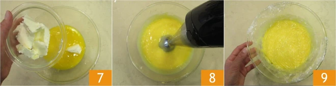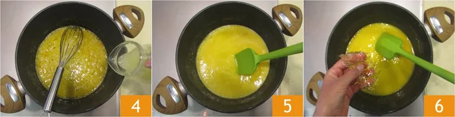 Now add the lemon juice 4 and heat the saucepan on the stove. Cook on a low flame, stirring all the while, until you reach a temperature of 180°F 5. When the cream thickens and the spatula is no longer visible, remove from the heat and add the isinglass, previously soaked in water and wrung out 6.