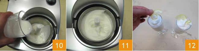 Pour the mixture into the ice cream maker (follow instructions for your machine) 10 and switch it on. As soon as the sorbet acquires a classic creamy consistency, which will take around 40 minutes 11, place it in glasses and serve your lemon sorbet garnished with zest 12.