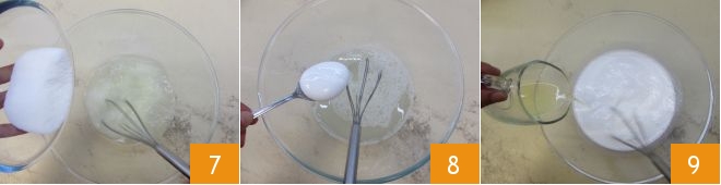 Whisk and add the remaining 0.75 cup of sugar 7, then gradually add the egg whites 8 so as not to deflate the soft mixture. After thoroughly mixing the ingredients together, add the limoncello and stir some more 9.