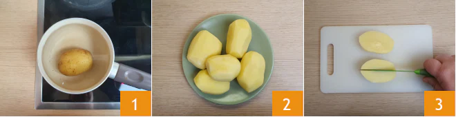 To prepare the meatballs and potatoes, start with the latter. Begin with those that will go into the mixture. Immerse the indicated amount in a pot with water and salt, bring to a boil, and count about 40 minutes: check the cooking by pricking with a fork; if the fork goes in easily, they are ready 1. Now move on to the potatoes for the side dish. After washing and peeling them 2, cut them into quarters 3.