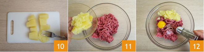Crush them 10 and add them to a bowl with the ground meat 11. Add the egg, salt, and a sprinkle of pepper 12