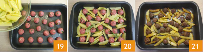 Add the potatoes with the seasoning 19 and distribute well. Bake in a preheated static oven at 350°F for about 45 minutes, taking care to turn the meatballs halfway through cooking until they are golden brown on the surface 20. For the last 5 minutes, turn on the grill (or increase the oven temperature) to form a delicious crust on both the meat and potato meatballs 21.