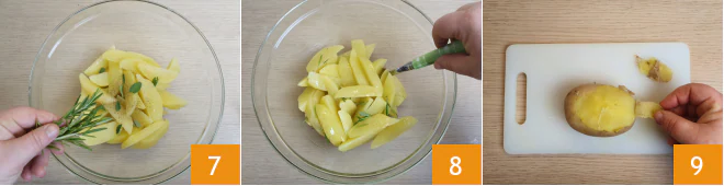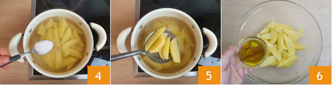 In a pot with boiling and salted water with a tablespoon of coarse salt 4, add the potato wedges and let them cook for 5 minutes: this way, the meat and potatoes will have the same cooking times in the oven. Drain the potatoes 5 and place them in a bowl. Season with olive oil 6,