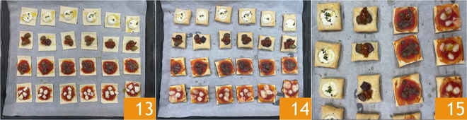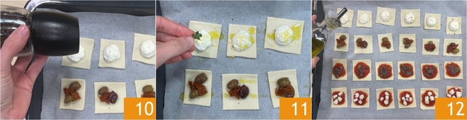 Add some diced mozzarella to the first row 4, with a pinch of oregano. Now garnish the puff pastry squares in the second row with the capers 5 and a piece of anchovy 6.