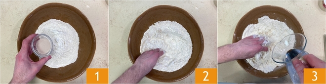 To prepare the Neapolitan casatiello, pour the flour and the dry yeast into a bowl 1, mix well to distribute it evenly 2, then stream in the water little by little, mixing by hand 3 with circular motions.