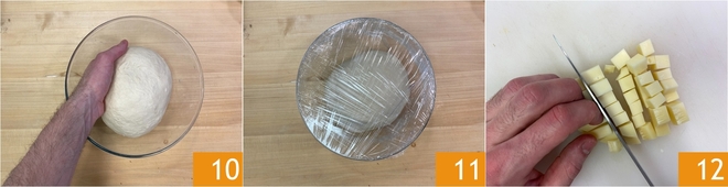 Transfer the dough to a bowl 10, cover with plastic wrap 11 and let rise at room temperature for 3 hours. Take care of the filling: cut the provolone into cubes of about 1 cm (about 3/8 in) 12.