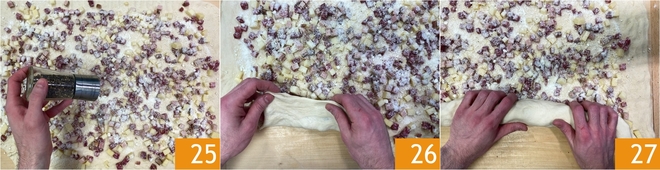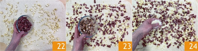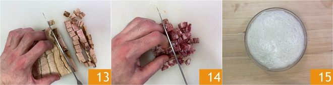 Do the same with the cicoli 13 and the salami 14. Take back the risen dough, which will have doubled in volume 15.
