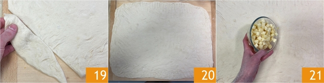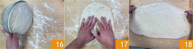 Transfer it to a lightly floured work surface 16, stretch it with your hands 17 to create a rectangle about 5/8 in thick (about 1.5 cm) 18.
