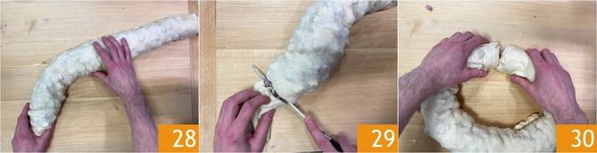 Press the dough at the closing point 28, cut off the ends 29 and join them to create a ring 30; to keep them firmly sealed, insert one end into the other, lifting the dough.