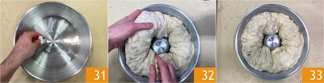 Grease a 12 5/8 in ring mold with lard 31. Place the casatiello in the pan 32 33.