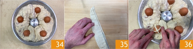 Insert 5 whole eggs at equal distances 34. Take the remaining dough and cut it into very thin strips 35. Use these small strips to form a cross over the eggs 36.