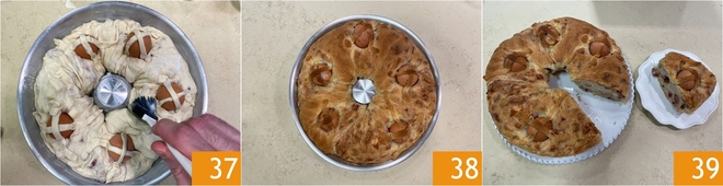 Brush the surface with melted lard 37 and let rise again for 1 hour at room temperature. Then bake in a preheated conventional oven at 356F on the lower rack for about 50 minutes, then continue for another 10 minutes at 392F on the upper rack 38. Remove from the oven, let cool slightly and then serve your homemade Neapolitan casatiello 39.