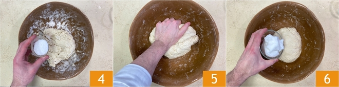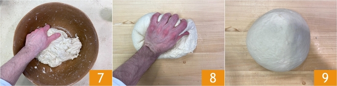 Lift strips of dough from the bottom toward the center to incorporate it evenly. Continue kneading until it is well combined 7, then transfer the dough ball to the work surface 8, perform a few folds, and shape the dough into a ball 9.