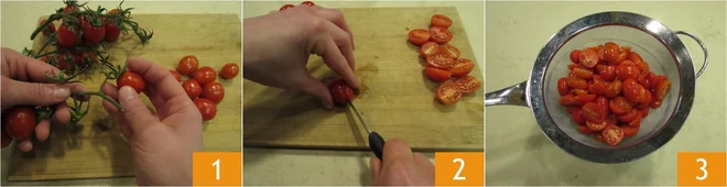To prepare orange chicken breast, start with the tomatoes. Destalk and rinse them 1, cut them in half 2 and place them in a colander inside a bowl, so that the excess liquid will collect at the bottom 3.