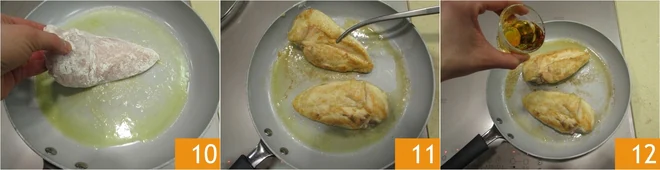 Heat some oil and butter in a pan on a low flame; as soon as the bottom is nice and hot, add the chicken 10 and thoroughly brown for a couple of minutes on both sides 11. When nice and golden, add the Grand Marnier, simmer and reduce: be very careful to avoid any backdraft if you are using a gas stove 12.