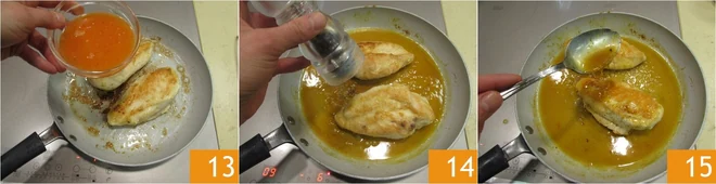 As soon as the alcohol has evaporated, which should take around 1 minute, add the orange juice 13 and leave to simmer; turn the meat over every now and then. Leave to cook for 10 - 15 minutes and half way through the cooking time add salt and pepper to taste (14-15).