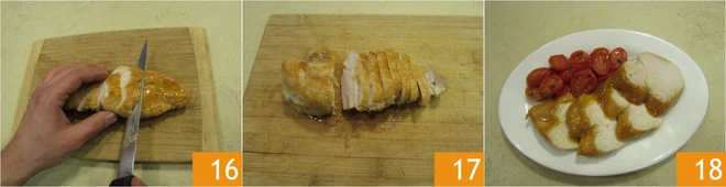 When done, place the chicken breast pieces on a cutting board or a plate and cut into slanted slices each around 0.8 inches thick 17. Garnish with the tomatoes and your orange chicken breast is ready: enjoy it while it's nice and hot 18!
