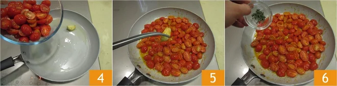 Heat some extravirgin olive oil in a pan together with an unpeeled garlic clove (remember to gently crush it in the palm of your hand), then add the tomatoes 4 and sauté for a few minutes. Add salt and pepper to taste and leave to cook for a few more minutes, before removing the garlic clove 5. When the tomatoes are slightly shriveled, which should take around 5 minutes, remove from the heat and add the thyme leaves 6.