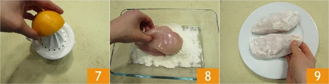 Prepare the rest in the meantime: cut the orange in half and squeeze the juice, which you can also filter to remove any pulp; leave to one side 7. Take the whole chicken breast, cut it in half and remove any fat and cartilage. Lastly, thoroughly coat both pieces in flour 8 and shake any excess off 9.