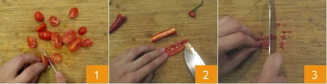 To make your pasta allo scarpariello, start by heating a saucepan with water to cook the pasta. Once the water is boiling, add a little salt. Take the Datterino tomatoes, wash them and slice them in half 1, then take the long fresh chili pepper, trim it and open it up to remove the seeds 2, before slicing it into strips and chopping it 3.