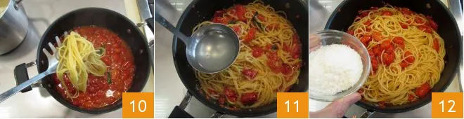 Meanwhile, boil the spaghetti 7 until it is cooked al dente. Once the tomato sauce is ready, season with salt, remove the garlic 8, and add some of the basil leaves 9. Add a ladleful of cooking water to create a delicious creamy texture.