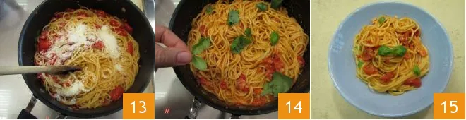 and stirring constantly so the cheese doesn’t go stringy 13. Flavor again with some basil leaves 14. Serve the pasta allo scarpariello immediately, adding more fresh basil to each plate 15.