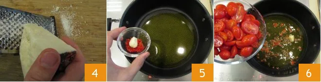 Grate the Pecorino Romano 4 and Parmigiano Reggiano cheeses. Pour the extra virgin olive oil into a large pot and heat. Add the chopped chili and the whole peeled garlic so it will be easier to remove 5. Fry for around 3 minutes, stirring occasionally, then add the datterino tomatoes 6, and cook over medium heat for around 10 minutes.