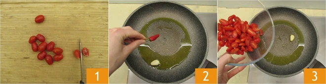 To prepare pasta with cherry tomatoes and shrimp, first wash the cherry tomatoes well and cut them in half lengthwise 1. In a pan, pour a drizzle of oil, a clove of garlic, and a chili pepper 2. Let it flavor over medium heat and when the garlic is well browned, add the cherry tomatoes 3.